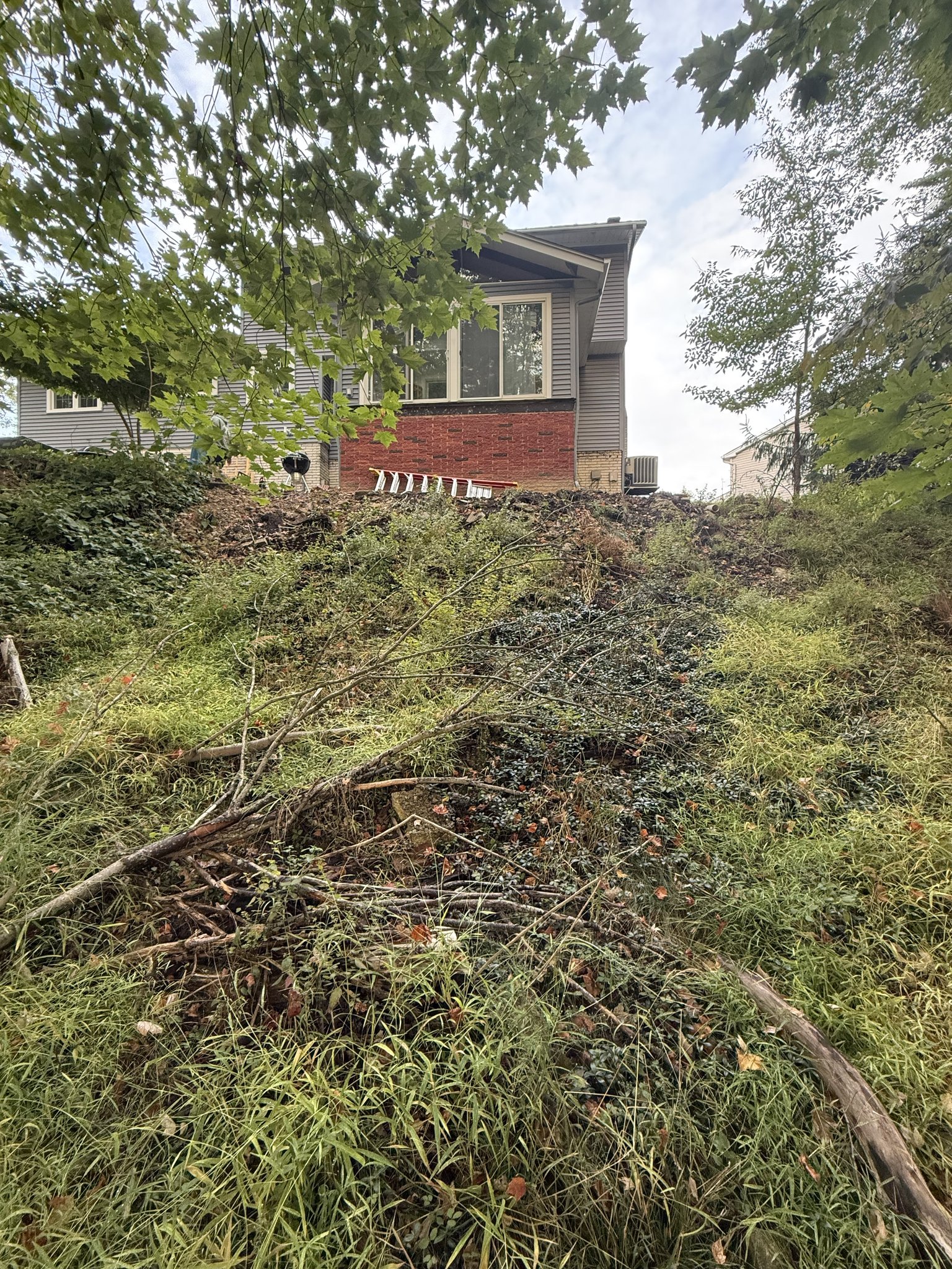 The property was experiencing slope erosion that had already begun affecting the home’s foundation. Brick along the home had shifted several inches, and prior contractor proposals included smaller block walls or gabion baskets that would not have provided the necessary structural support.