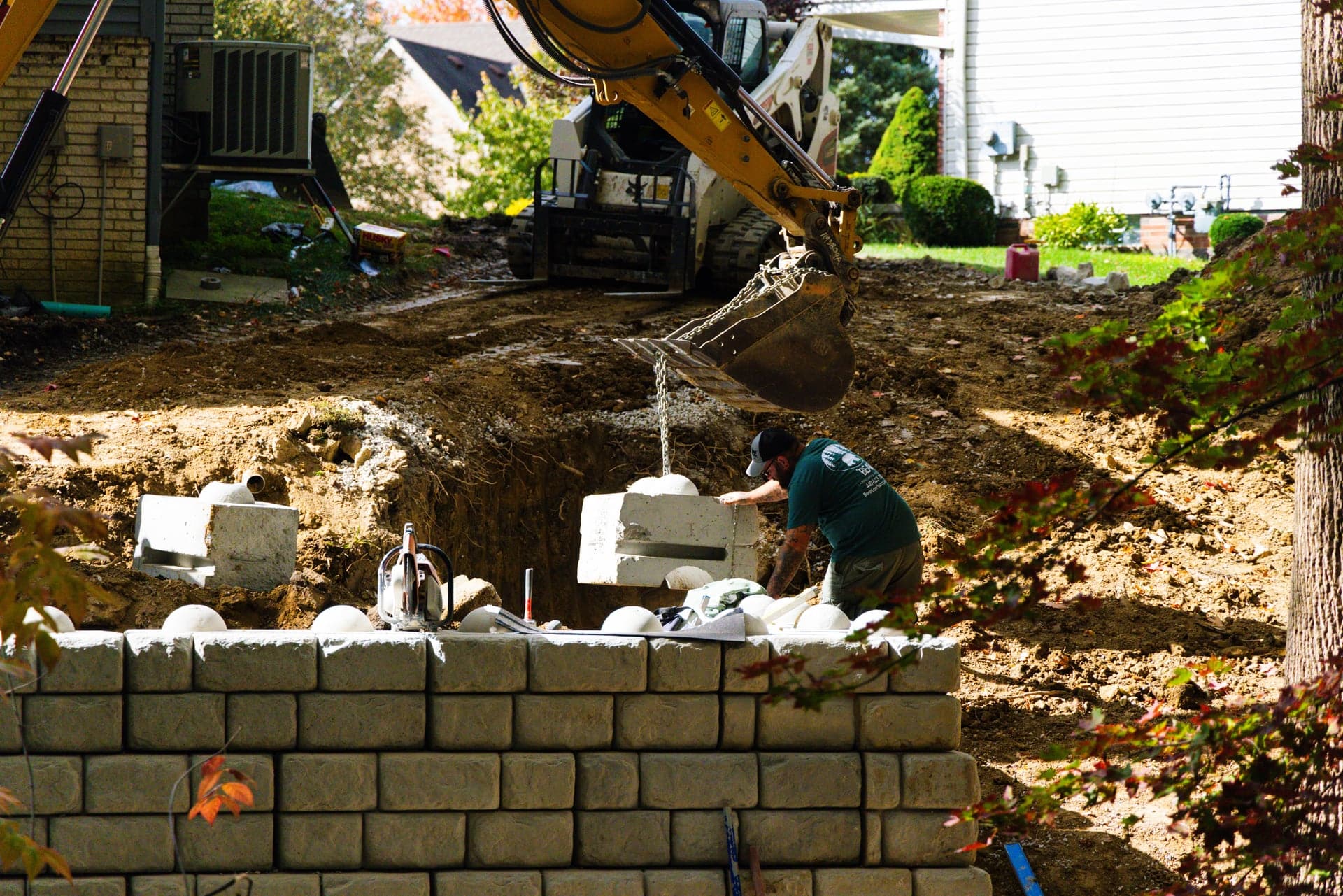 This project involved stabilizing a residential property experiencing significant erosion and structural movement. The homeowner’s foundation was beginning to separate, creating a serious long-term risk. Bear Landscaping & Design designed and installed a large-scale Redi Rock retaining wall system to permanently correct the issue and restore structural stability.